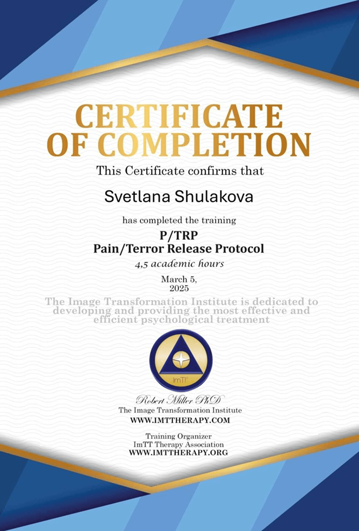 В зависимости от вашего запроса я рекомендую метод и продолжительность встреч: EMDR или КПТ, один час или полтора. Но финальный выбор за вами.
