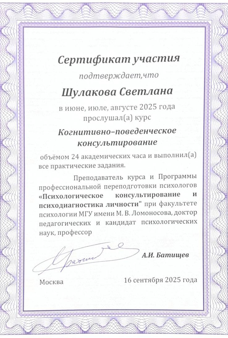 «Когнитивно-поведенческое консультирование» МГУ им. М.В.Ломоносова